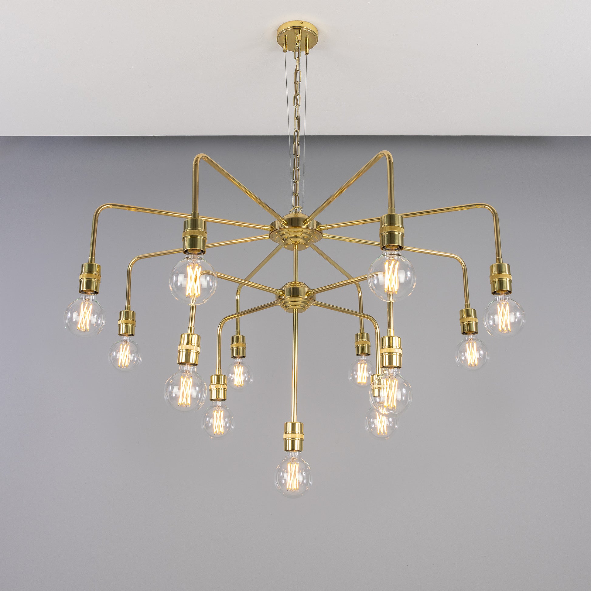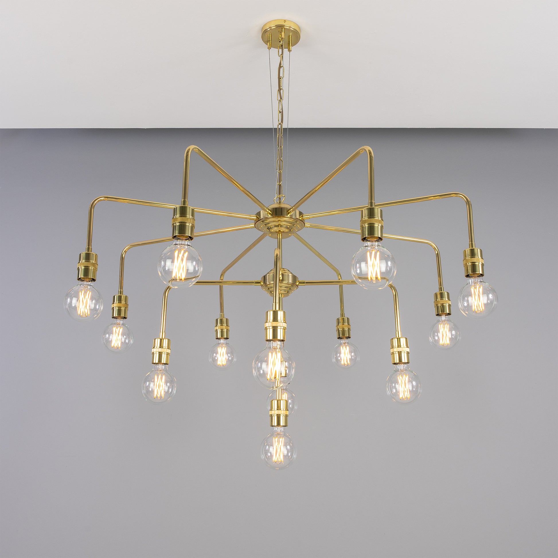 The Pisa 13-Light Three-Tier Bare Bulb Brass Chandelier is a bold, architectural centrepiece designed to command attention. Featuring three concentric tiers of exposed E27 bulbs arranged around a solid brass frame, this chandelier delivers powerful, ambient illumination with an unmistakably industrial edge. The open structure allows light to radiate freely, creating dramatic shadows and a striking visual rhythm. Perfect for large dining areas, stairwells, atriums or commercial interiors, Pisa balances raw character with refined craftsmanship, making it ideal for industrial, contemporary and statement-driven spaces.