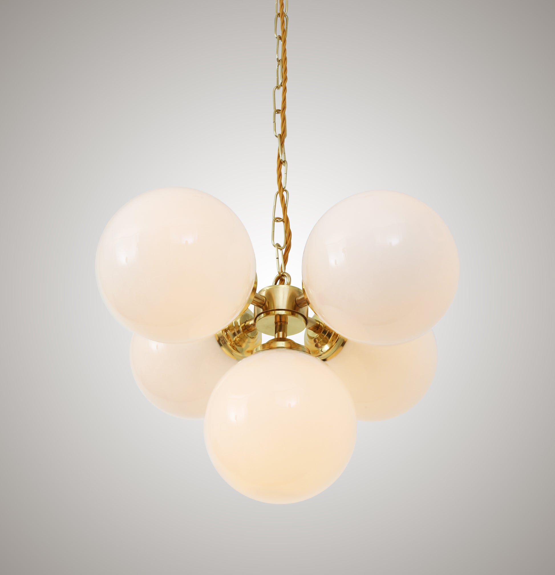 The Yaoundé 5-Light Globe Brass Chandelier brings refined elegance and soft contemporary charm to any interior. Five opal glass globes sit gracefully on slender brass arms, diffusing light beautifully to create a warm, welcoming glow. With its balanced structure and clean silhouette, this piece suits dining rooms, bedrooms, hallways and modern living spaces. Crafted from high-quality brass and glass with premium finishing, the Yaoundé chandelier adds a luxurious, understated focal point without overwhelming the room. Perfect for those seeking timeless design with subtle sophistication.